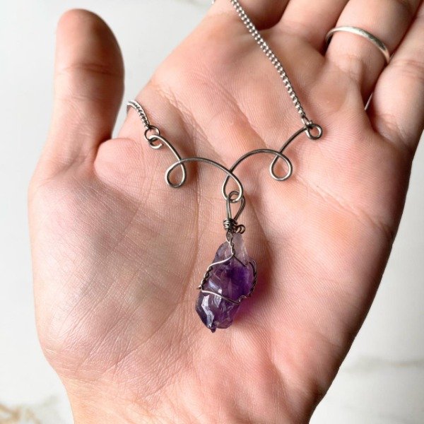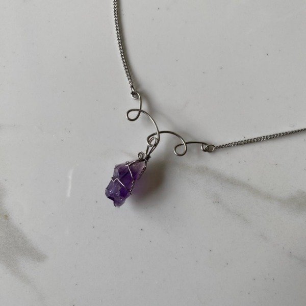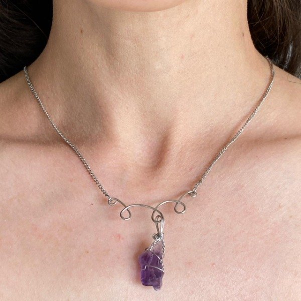 Collar fabricado artesanalmente con acero quirúrgico y cristal de Amatista en bruto.