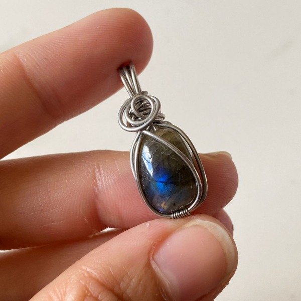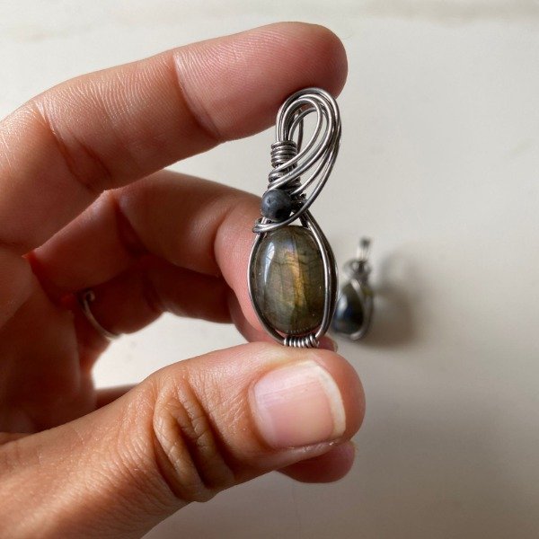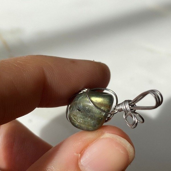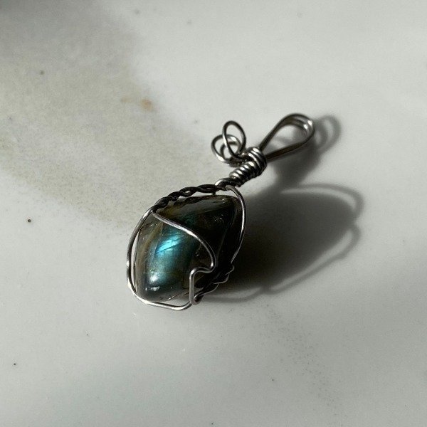 Dije engarzado artesanalmente con acero quirúrgico y Labradorita pulida.