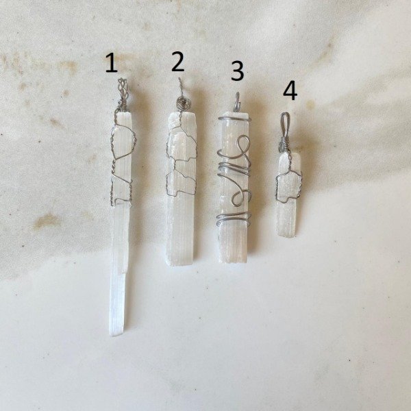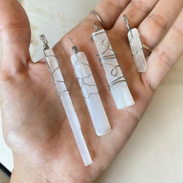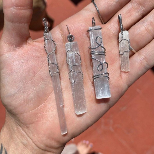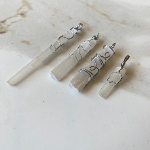 Dije engarzado artesanalmente con acero quirúrgico y Selenita.