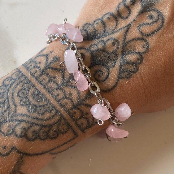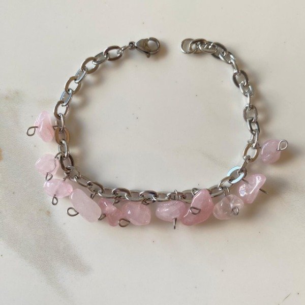 Pulsera fabricada artesanalmente con cadena de acero quirúrgico y cristales naturales pulidos de Cuarzo rosa.