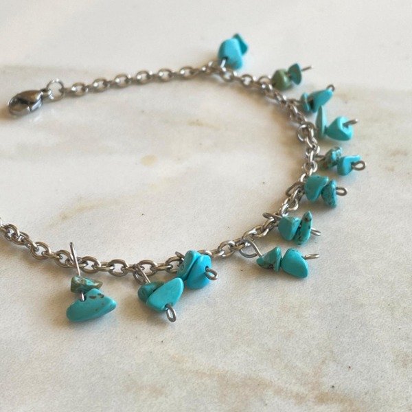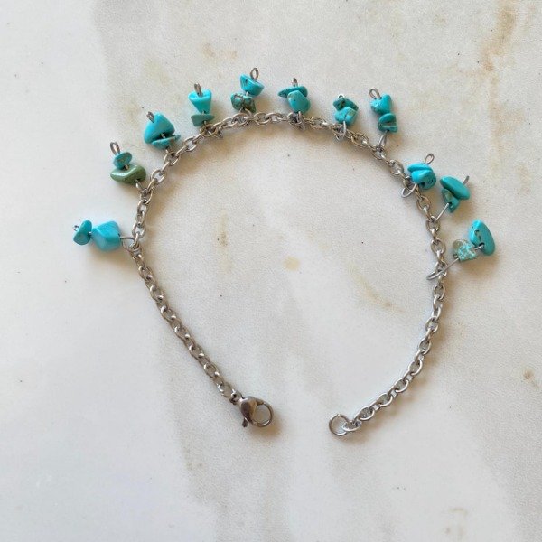 Pulsera fabricada artesanalmente con cadena de acero quirúrgico y cristales naturales pulidos de Turquesa.