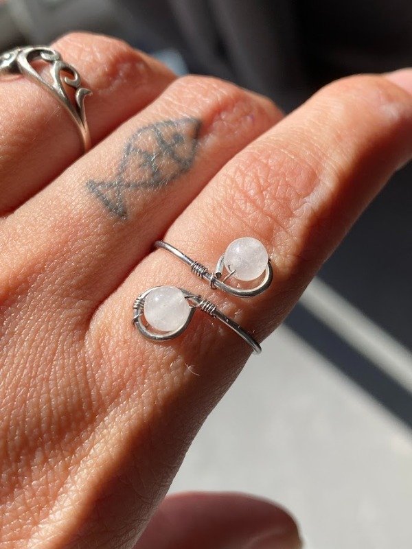 Anillo fabricado artesanalmente con acero quirúrgico y bolitas de Cuarzo rosa.