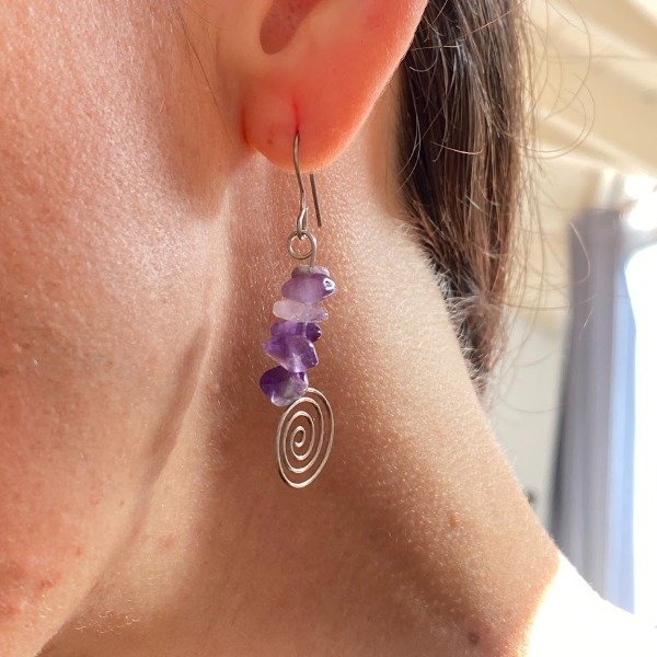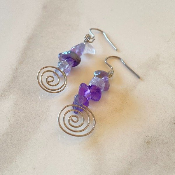Pendiente fabricado artesanalmente con acero quirúrgico y cristales naturales pulidos de Amatista